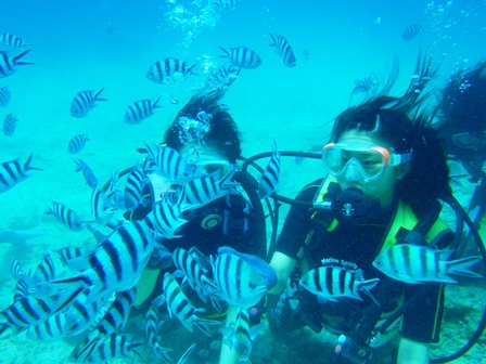 修学旅行でダイビング! 今日の出会い 2015.06.19 沖縄県恩納村にあるダイビングショップ ブルーリーフ 本日の出会い! 本日は、岡山県倉敷市からの修学旅行生達と一緒に遊んできました〜 みんな、ワクワクとドキドキの入り混じった感じでの初ダイビング! でも、みんなとても上手に泳げてましたね〜! しかも、終わってからの感想が 『超楽しい〜』『超キレイ〜』『もう終わったの〜?』 と本当に楽しんでいた様子! 生徒29名と先生1名、総勢30名 全員潜れてよかったね〜! また遊びに来て下さいね〜!!